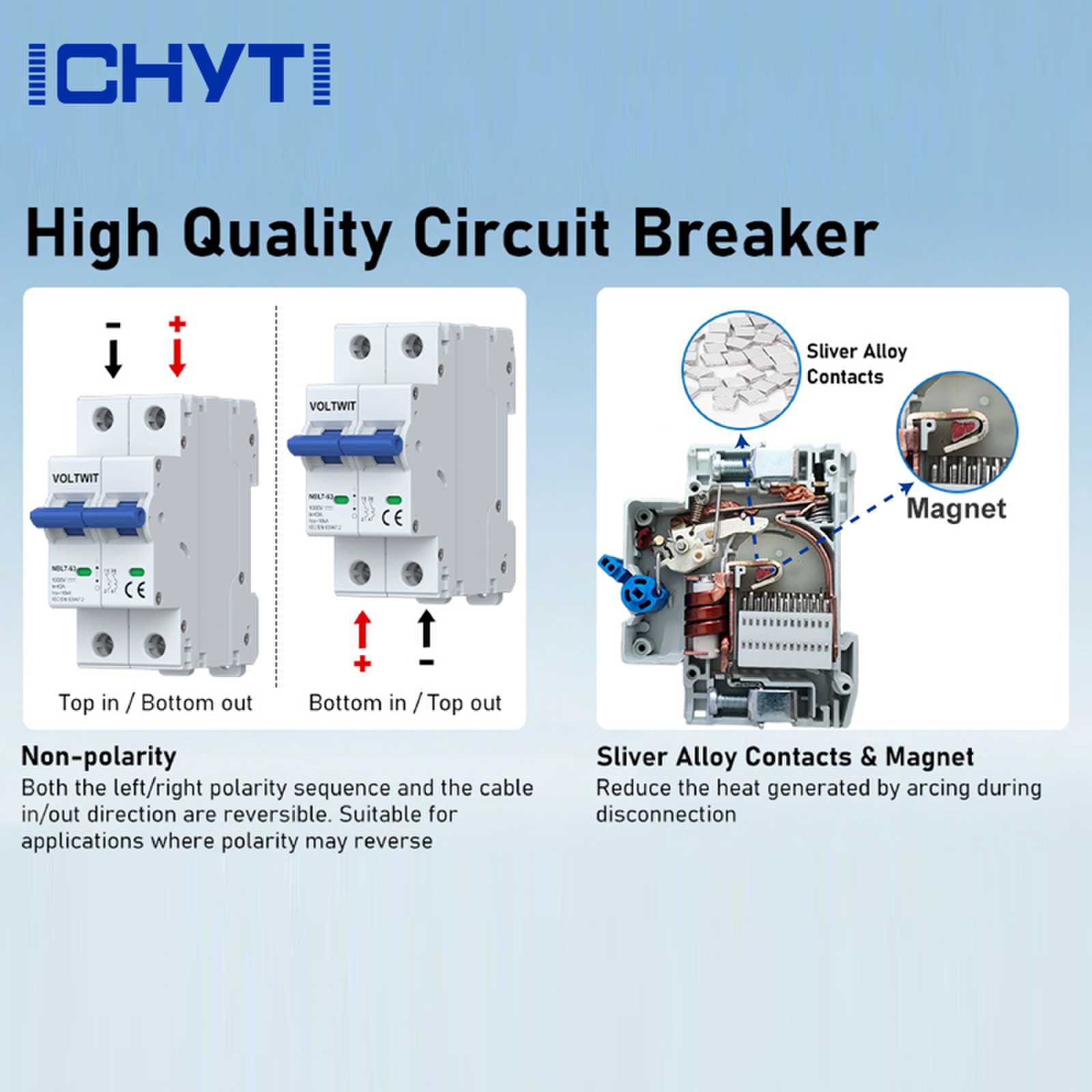 ◉ Otro beneficio clave de nuestro disyuntor de CC es su facilidad de instalación y mantenimiento. El interruptor incluye funciones simples pero potentes que hacen que la instalación sea rápida y sencilla. Además, el disyuntor está diseñado para facilitar la resolución de problemas y el mantenimiento, con indicadores claros para una fácil identificación de fallas y un acceso sencillo a los componentes internos.