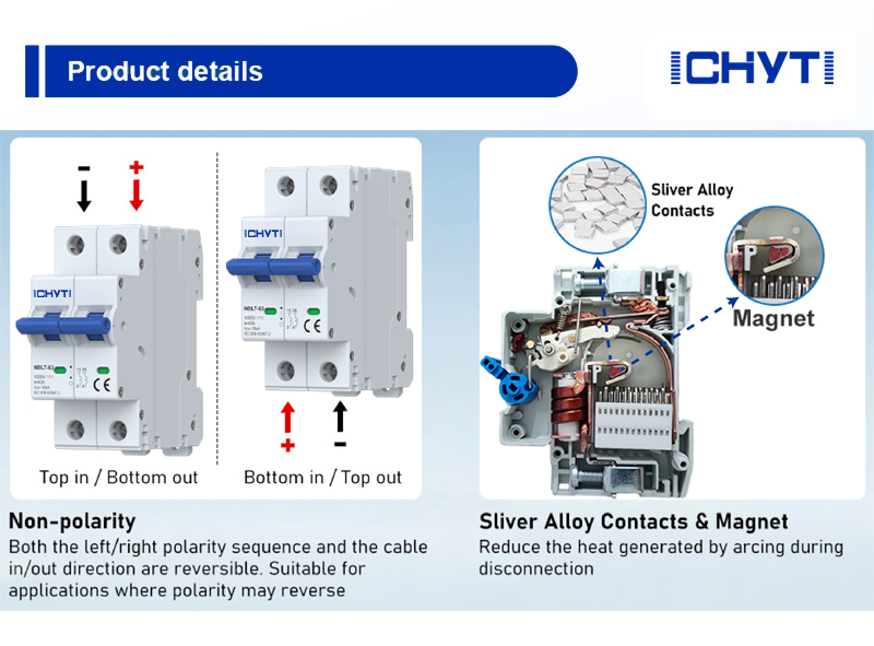 Los productores de CHYT en China ofrecen productos de alta calidad; le invitamos a comprar un disyuntor de CC directo de alta calidad a buen precio. Este disyuntor miniatura de CC ICHYTI de proveedores de China es adecuado para circuitos de CC nominales inferiores a 1000 V, se utiliza principalmente para protección contra sobrecargas y cortocircuitos, y se puede utilizar para conmutación de operaciones ocasionales. Su corriente nominal no excederá los 63A.
