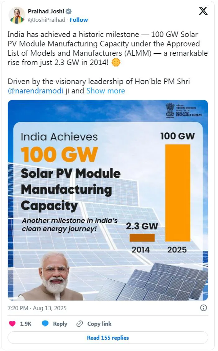 Prahad Joshi, Ministro de la Nueva Alianza de Energías Renovables de la India, enfatizó este logro y afirmó: "India ha alcanzado un hito histórico: según la Lista de Modelos y Fabricantes Aprobados (ALMM), la capacidad de producción de módulos solares fotovoltaicos ha alcanzado los 100 gigavatios, ¡un aumento significativo con respecto a los 2,3 gigavatios de 2014! Bajo el liderazgo visionario del Primer Ministro Narendra Modi y la fuerza impulsora de iniciativas transformadoras como la Con el Programa de incentivos vinculados a la producción de módulos solares eficientes (PLI), la India está construyendo un ecosistema de fabricación solar sólido y autosuficiente. Este logro mejorará el ritmo hacia Atmanirbhar Bharat y ayudará a la India a alcanzar su objetivo de alcanzar 500 gigavatios de capacidad de producción de energía no fósil para 2030.