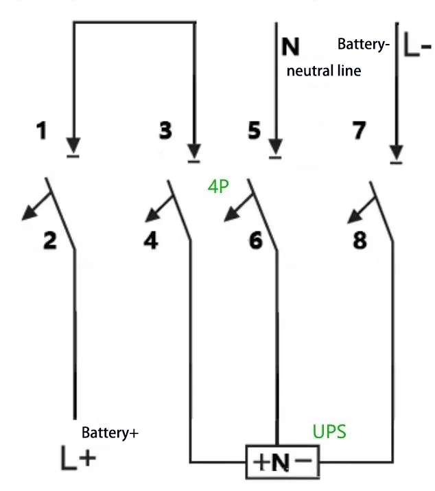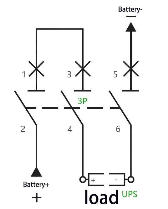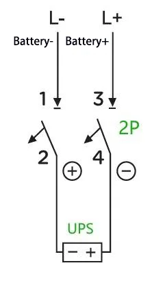 MI:Por ejemplo: para un UPS con una capacidad de 40 kVA, una cadena de baterías nominal de 40 celdas y una conexión de cable neutro (voltaje de carga de ecualización: 14 V × 40 = 560 V, es decir, ±280 V), la corriente operativa máxima se calcula como 40 kVA × 1,0 ÷ 90 % ÷ 10 V ÷ 40 = 111 A. A 4P 750 V Se puede adoptar un disyuntor de 150 A, con dos de sus polos conectados en serie. El método de cableado es el siguiente: